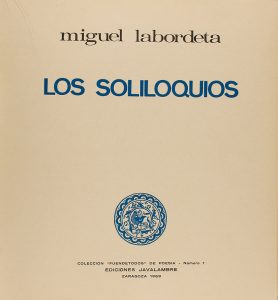 1969. (VANGUARDIAS-POESIA). LABORDETA, MIGUEL: SOLILOQUIOS. Zaragoza: Javalambre, 1969 Fuendetodos. 4º menor. 100 p. aprox. Enc. editorial en cartoné.