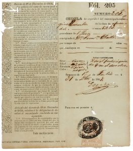 1867. (CUBA-ESCLAVITUD). CEDULA DE SEGURIDAD DE UN ESCLAVO. Cédula reintegrada con sello de 1 escudo. Mitad impresa, mitad manuscrita.