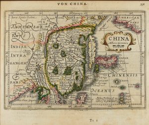 1607 ca. KEERE, Van den (Pieter): CHINA MILLIARIA GERMANICA; INDIA ORIENTALIS; INSULAE INDIAE ORIENTALIS.  Mapa grabado coloreado de época. 18 x 22,5 cm. En el reverso texto en latín.