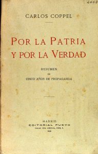 1920. (MILITARIA). COPPEL, CARLOS: POR LA PATRIA Y POR LA VERDAD. RESÚMEN DE CINCO AÑOS DE PROPAGANDA. Madrid: Ed. Pueyo, 1920. 8º mayor. 383 p. Rústica rozada. Papel tostado.