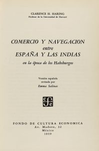 1939. (COMERCIO INDIAS). HARING, CLARENCE H.: COMERCIO Y NAVEGACION ENTRE ESPAÑA Y LAS INDIAS EN LA EPOCA DE LOS HABSBURGOS. México: Fondo de Cultura Económica, 1939. 4º menor. XXVI p. + 460 p. Enc. en media piel con hierros en el lomo. Conserva...
