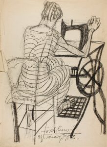1986. CUROS, JORDI: MUJER COSIENDO A MAQUINA. Carboncillo, 50x35,5 cm. Firmado y fechado por el autor.