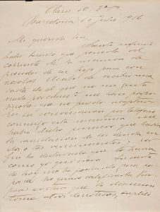 1916. LOTE DE MANUSCRITOS: CARTA MANUSCRITA Y FIRMADA POR JAIME BROSSA DIRIGIDA A UN FAMILIAR SUYO. 2 h. manuscritas por una cara. Firmada en Barcelona, 15 de julio de 1916. Jaime Brossa i Roger fue un dramaturgo y articulista catalán (1875-1919)...
