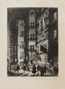 DREVET (Joannès). Le Lyon de nos pères. illustré de 20 eaux-fortes sur satin. Lyon, Bernoux, Cumin & Masson, 1901 ; in-4 en ff., chemise de toile rouge, trace de lacets en gouttière. Recueil de 6 (sur 20) eaux-fortes originales de Drevet pour...