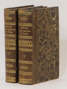 GROSLEY (Jean-Pierre). Mémoires historiques et critiques pour l'histoire de Troyes. Paris, Troyes, Volland, Sainton, 1811 ; 2 vol. in-8, demi-basane marron, dos lisses ornés de motifs dorés, [Rel. de l'époque], légèrement frottées. Portrait...