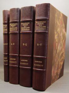 ROSEROT (Alphonse). Dictionnaire historique de la Champagne méridionale (Aube) des origines à 1790. Langres, Angers, Imprimerie champenoise, Éditions de l'Ouest, 1942-1948 ; 4 vol. in-4, demi-chagrin marron à coins, dos à nerfs, couvertures...