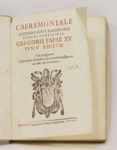 Caeremoniale continens ritus electionis Romani Pontificis Gregorii Papae XV. Jussu editum. cui praefiguntur constitutiones pontificae, et conciliorum decreta ad eam rem pertinentia. Romae, ex Typographia Cameræ Apostolicæ, 1622 ; in-8, parchemin...
