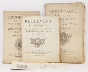 • Réglement provisoire, concernant le service intérieur, la police & la discipline des troupes à cheval. Du Ier juillet 1788. Paris, imprimerie royale, 1788 ; in-4, brochure d’attente.