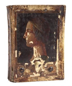 2 parties en un volume petit in-4°, vélin ivoire, premier plat entièrement orné d’un profil féminin peint (125 x 152 mm) dans un cadre doré portant deux boulons de bronze en pied (reliure de l’époque).