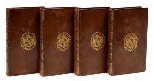 4 volumes in-8°, veau glacé, armoiries dorées au centre des plats, dos à nerfs orné (reliure de l’époque).