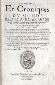 [ZONARAS (Jean)]. Les Histoires et Croniques dv Monde […] descriuant toutes Histoires memorables auenuës en ce monde : en la Reuolution de six mille six cens ans & plus, & principalement de la Turquie. Disposez en trois livres […]. Traduit...