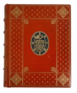 In-folio, maroquin orangé, large décor d’encadrement au semis de lys et de croix de Lorraine ornant les plats, fleuron aux angles, armoiries mosaïquées au centre, dos à nerfs orné du même décor, dentelle intérieure mosaïquée, doubles gardes, tête dorée, couverture conservée (r. Wiener Nancy – A. Déstrées succr.).