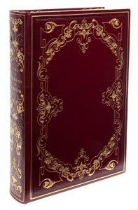 In-4°, maroquin bordeaux, filets doré et à froid et large dentelle aux petits fers ornant les plats, dos lisse orné du même décor, contreplats et gardes de moire mauve, les premiers ornés d’un décor d’encadrement, doubles gardes, tranches dorées, étui (René Aussourd - 1913).