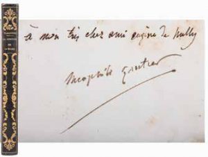 Louis Boulanger, gravé sur bois par Lacoste Jeune. Édition originale enrichie sur le faux-titre d’un bel envoi autographe signé de Gautier à son ami de collège Eugène de Nully : «A mon très cher ami Eugène de Nully».