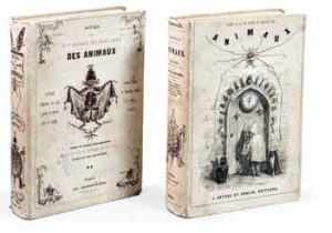 Grandville (J.-J.). Scènes de la Vie privée et publique desanimaux. Paris, Hetzel et Paulin, 1842, 2 volumes in-4 reliés plein cartonnage-papier illustré par Grandville, portant aux seconds plats les dernières publications d’Hetzel. Edition