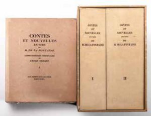 [Derain] La Fontaine Jean de. Contes et nouvelles en vers. Paris,Aux Dépens d’unamateur, 1950, 2 volumes in-4 en feuilles sous couvertures et emboîtages. Illustré de 67 lithographies originales d’André Derain. Tiré à 200 exemplaires