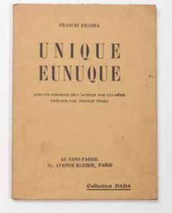 Picabia Francis. Unique Eunuque. Préface par Tristan Tzara. Paris, Au Sans Pareil, 1920, in-12 broché, petite déchirure à deux feuillets sans gravité ni manque. Illustré du portrait de l’auteur par lui-même. Edition originale, un des 1000