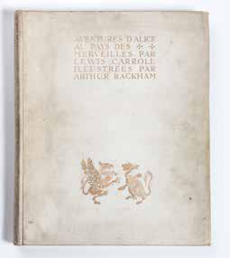 [Rackham] Carroll Lewis. Aventures d’Alice au pays des merveilles. Paris, Hachette, Sd. (1907), in-4 relié plein cartonnage éditeur crème poussièreux, plat illustré et titré. Illustré d’un frontispice, de 12 planches en couleurs