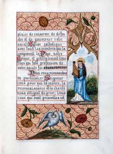 majuscules de couleurs, rouge et bleu, et des fins de lignes décorées. Le texte, en français, comporte quelques grandes lettrines peintes; il est inséré dans de larges encadrements à décor foliacé et de rinceaux où naviguent quelques oiseaux, papillons, poissons ou animaux fantastiques, au sein de fleurs et fruits sur fond doré, sablé, à bandes bicolores ou à décor géométrique.Lesencadrementscomportentsouvent des miniatures, parfois même des illustrations sur l’intégralité du cadre. Les prières de la messe, confiteor, épître, graduel, évangile, offertoire, canon, élévation et autres prières sont suivies d’une partie consacrée à la messe de mariage, comportant elle aussi plusieurs grandes miniatures. Un feuillet, précédant les prières de la messe de mariage, indique le nom pour qui le manuscrit a été exécuté et donne les date et lieu de la cérémonie, le 27 juin 1894 en l’église de Notre-Dame de Lorette, à Paris. Le manuscrit est recouvert d’un plein maroquin bleu signé de Kauffmann, comportant sur le premier plat un médaillon de bronze argenté aux chiffres Jm, Jenny Masson, nom d’épouse de la propriétaire du livre d’heures, double filet sur les coupes, large roulette et filets dorés, pleins et au pointillé en contreplat, gardes de moire bleue, tranches dorées, présenté dans un étui de protection.