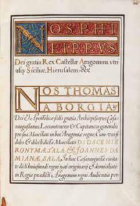 l’encre noire avec encadrement d’un double filet, large et mince. Le texte latin est accompagné de parties peintes, de rouge, de bleu et d’or. Le manuscrit est un pacte passé entre Thomas Borgia, évêque de Saragosse, au nom de Philippe, Roi de Castille, d’Aragon, de Sicile et de Jérusalem, et les lieutenants et capitaines Sala, du royaume d’Aragon. Le document est signé, in fine, par les interessés. Le manuscrit est recouvert d’une somptueuse reliure aux multiples symboles dorés, comportant quelques petits défauts.