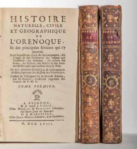 fruits, des résines, des herbes et des racines médicinales qui naissent dans le Païs. Avignon, 1758, 3 volumes in-12 de Xviii, (8), 388, (4); (2), 334, (4); et (2), 332 et (4) pages illustrées d’une grande carte rempliée et de deux gravures hors texte. Relié plein veau granité de l’époque, dos lisse ornés, pièces de titre (une manque), coins émoussés, reliures fanées. Edition originale de la traduction française. Un des ouvrages les plus intéressants et les plus curieux sur le pays de l’Orénoque.