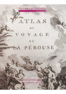 in-folio. Les volumes de texte sont brochés sous couvertures d’attente, dans un état nécessitant une reliure. L’atlas est relié dans un cartonnage dont le dos est manquant. Édition originale de cette relation de voyage, ornée d’un portrait de La Pérouse gravé par Tardieu en frontispice du premier volume, et accompagné d’un atlas renfermant un titre-frontispice de Moreau gravé par Trière et 69 planches, dont une grande mappemonde dépliante, 20 cartes à double page, 10 cartes à pleine page et 38 planches de vues, relevés côtiers, histoire naturelle, scènes de mœurs, costumes et types indigènes, le tout gravé en taille-douce par Le Pagelet, Thomas, Godefroy, Choffard, Avril, Legrand et d’autres d’après Duché de Vancy, Blondela, Prévost, La Martinière, etc. La France voulant compléter les travaux de Cook et de Clarke, décida d’envoyer une expédition pour rechercher un passage au nord-ouest de l’Amérique. Louis Xvi confia cette mission à La Pérouse. Parti de Brest en 1785 à bord de deux corvettes, La Boussole et L’Astrolabe, il parcourut le Chili, l’île de Pâques, les îles Sandwich, Hawaï, l’Alaska, la Californie, Macao, Manille, les mers de Chine et du Japon, les îles Tonga et l’Australie. Les embarcations disparurent en mer alors que la dernière lettre de La Pérouse, écrite de Botany-Bay, datait du 7 février 1788, lieu où l’expédition s’était réfugiée après le massacre par des indiens de treize membres de l’équipage sur l’île de Maouna. Cette relation officielle de l’expédition fut publiée par Milet-Mureau d’après les documents que Lesseps, interprète et historiographe de l’expédition, ramena en 1787, peu de temps avant le drame.