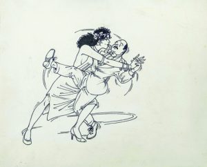 Dessin à l’encre noire sur carton pour un projet d’affiche de « Le quart d’heure américain » montrant