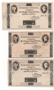[Révolution française] Assignat de 25 livres à face royale. 1 ex. de vingt-cinq livres du 16 décembre 1791 et 2 ex. du 24 octobre 1792. En l'état.