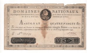 [Révolution française] Assignat de 80 livres à face royale. Création du 29 septembre 1790. 1 exemplaire de quatre-vingts liv., série J n°37331, en l'état.