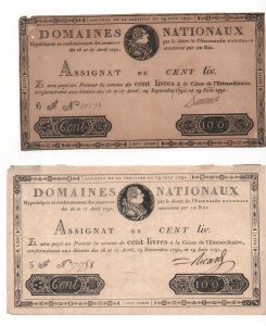 [Révolution française] Assignat de 100 livres à face royale. Création du 19 juin 1791. 2 ex. de cent liv., série 3 F n°7758 et série 6 F n°20 879, en l'état.