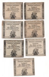 [Révolution française] Assignat de 10 sous. Lot de 87 exemplaires.3 feuilles complètes de 20 ex. du 4 janvier 1792 - 5 ex. du 24 octobre 1792 - Feuille complète de 20 ex. et 2 ex. découpés du 23 mai 1793. État moyen à T.B.E.