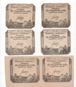 [Révolution française] Assignat de 50 sols. Lot de 89 exemplaires. 2 ex. du 4 janvier 1792 - 4 feuilles complètes de 20 ex. et 7 ex. du 23 mai 1793. État moyen à T.B.E.