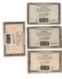 [Révolution française] Assignat de 10 livres. Lot de 33 exemplaires. Feuille complète de 10 ex., demie feuille de 5 ex. non découpés et 2 ex. découpés du 16 décembre 1791 - Feuille complète de 10 ex. et 6 ex. découpés du 24 octobre 1792...