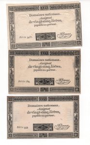 [Révolution française] Assignat de 25 livres, 15 exemplaires. Création du 6 juin 1793, l'an II de la République. 5 ex. de vingt-cinq livres, découpés, en l'état - Feuille complète de 10 ex., bon état.