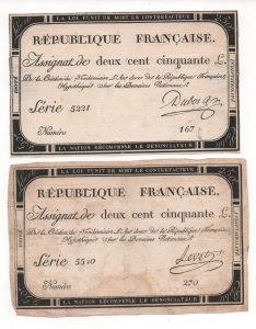 [Révolution française] Assignat de 250 livres, création du 7 vendémiaire de l'an 2 (28 septembre 1793). 3 ex. de deux cent cinquante liv., découpés, états divers - 2 feuilles complètes (assignat imprimé unitairement).