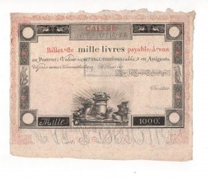 [Révolution française] Caisse patriotique, 1792. 1000 Livres type Caisse Patriotique, billet qui ne fut jamais émis, non daté, grande marges, très rare document de la Révolution. Joint : 2 billets d'échange au porteur : 3 liv. bureau...