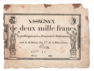 [Révolution française] Assignat de 2000 francs, création du 18 nivôse de l'an 3 (7 janvier 1795). Feuille complète d'un assignat de deux mille francs, de type courant, avec au verso le médaillon de la Victoire imprimé en noir à l'identique...