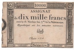 [Révolution française] Assignat de 10 000 francs, création du 18 nivôse de l'an 3 (7 janvier 1795). Exemplaire de dix mille francs, de type courant. En l'état. Joint : L.S. par Claude-Urbain de Retz de Servières (1755-1804), alias Reth,...