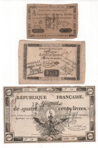 [Révolution française] Faux assignats. 5 exemplaires. 1 ex. de cinq livres du 1er novembre 1791 - 1 ex. de dix livres du 24 octobre 1792 - 2 ex. de cent liv. du 19 juin 1791 à face royale - 1 ex. de quatre cents livres du 21 novembre 1792. Tous...