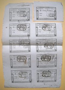 [Révolution française] Mandat territorial de 5 francs. 10 exemplaires [1798]. 1 ex. découpé et 9 ex. sur planche gravée in-8. Portant chacun un cachet fiscal noir de 15 centimes