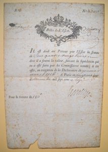 1715, de nombreux billets destinés à remplacer les monnaies métalliques, souvent absentes de la circulation, étaient créés par divers corps organisés : Billets de l'artillerie, de la Caisse des Gabelles, de la Caisse des Emprunts, des États-Majors, de l'Extraordinaire des Guerres, des Fermiers Généraux, des Ingénieurs, des Loteries, de la Marine, des Pensions... etc. Ces billets ne circulaient que dans le corps émetteur et n'étaient garantis que par cet émetteur. L'État lui-même émettait des "BILLETS de MONNOYE ", sortes de reçus remis contre les pièces d'or déposées par les particuliers dans les Caisses pour être refrappées (ou surfrappées) aux nouveaux types (lors d'un changement du portrait officiel du souverain, par exemple). Au passage, l'Etat prélevait une part, en paiement de cette transformation et également augmentait la valeur de chaque pièce, ce qui était tout simplement une dévaluation. Face aux protestations concernant la lenteur de l'État à remettre aux déposants les nouvelles pièces, le Conseil du Roi donna COURS LÉGAL aux billets de Monnoye, par l'Édit de septembre 1701. Les billets devinrent donc, à cette date, le premier papier-monnaie officiel français. Les émissions de billets de Monnoye se succèdent jusqu'en 1712, de nouvelles émissions remboursant les précédentes. Dans le but d'absorber tous ces billets, l'État crée, le 7 décembre 1715 les "Billets de L'Estat ". Ils portent l'inscription : " Il est deub au Porteur par l'Estat la somme de --- dont il a fourni la valeur ". Il sera émis pour 250 millions de livres en billet de L'Estat, de valeurs nominales diverses, manuscrites : de 30 à 1 000 livres. Ils sont aujourd'hui d'une extrême rareté.
