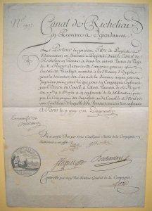 une illustrée d'une gravure de médaille, toutes deux signées de la main des administrateurs Despuech, Albertas, Floquet, De Chanlay, etc. Rares exemplaires, très recherchés par les scripophiles. Parmi les projets d'utilisation des eaux de la Durance conçus au 18° siècle, le plus ambitieux fut celui du Canal de Richelieu. Son promoteur, l'ingénieur J.A. Floquet y consacra en vain quarante années de sa vie, de 1730 à 1769, en vue de relier les eaux de la Durance aux villes d'Aix et de Marseille. Soutenu par le Maréchal de Richelieu, petit neveu du célèbre cardinal, il réussit en dépit de la réticence des propriétaires des terrains concernés et de nombreuses intrigues à réunir un groupe d'actionnaires et à fonder la Société au nom du principal d'entre eux, titulaire des 1000 actions de 600 livres sur les 9600 constituant le capital social. Dès 1752, la Cie se trouva en difficulté, faute de moyens financiers suffisants face à des travaux plus coûteux que prévus. Après le percement d'environ 4 kms, les travaux furent suspendus et les tentatives de création d'une Cie nouvelle échouèrent. Floquet abandonna ses droits en 1769 et mourut en 1771.