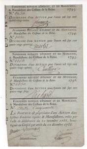 [Louis XVI - Actions] Fonderies royales d'Indret et de Montcenis. 9 coupons de dividende de l'action en feuille émis en 1786.