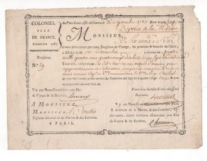 [Louis XVI] Colonies, Îles de France et de Bourbon. 1 pièce, 1783. Traite officielle pour le paiement des appointements et subsistance de M. de Tromelin, capitaine de vaisseau commandant le vaisseau royal l'Annibal. Bernard-Marie Boudin, seigneur...