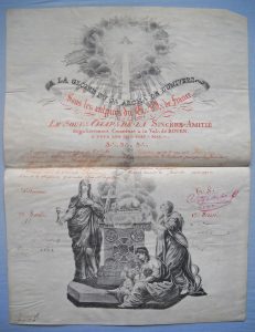 Réunis " à Paris en 1880 ; loge des " Hospitaliers français " à Paris en 1881. Joint : diplôme sur parchemin décerné par la loge de la " Sincère Amitié " à Rouen, non daté - Diplôme vierge sur papier de la loge maçonnique de " Saint Amable " de Riom - Diplôme de compagnon du tour de France délivré à Tours en 1854 - Diplôme de compagnon du tour de France charpentier délivré à Saumur en 1841 - 3 diplômes vierges sur parchemin - 5 diplômes vierges sur papier.
