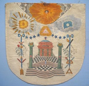 [Tablier] Tablier de Maître en peau à décor imprimé et peint. Au centre, sur le pavé mosaïque, un temple entouré de deux colonnes surmontées de grenades éclatées. Les outils maçonniques figurent de part et d'autre avec le fil à plomb. Une...