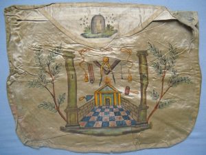 [Tablier] Tablier de Maître en soie peinte. Au centre, sur le pavé mosaïque, un temple entouré de deux colonnes et surmonté des outils maçonniques et de cordons. Sur la bavette, une ruche. XIXe siècle. 26 x 33,5 cm. (usures et manques)