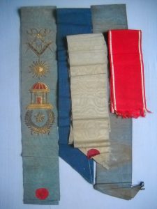 [Cordon] 5 cordons dont un cordon de maître à décor de fil doré et cannetilles, et 1 sautoir. Joint : 2 tabliers dont un à décor peint sur peau.