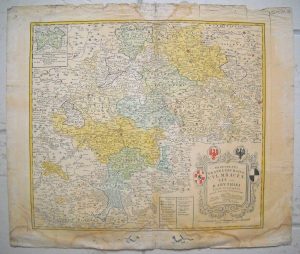 dans un cartouche, légendes en allemand, ill. et armoiries en coloris d'époque. 56 x 67 cm. Pli vertical, mouillures en marges, petits défauts - " Archiepiscopatus et electoratus Coloniensis ut et ducatum Iuliacensis et Montensis nec non comitatus Meursiae nova tabula / excudente Iohan. Baptista Homanno " [archevêché et électorat de Cologne, 1724], cartouche, ill. et armoiries en coloris d'époque. 58 x 67 cm. Pli vertical, mouillures, défauts en marges - Tabula geographica exhibens regnum Sclavoniae cum Syrmii ducatu ex mappa grandiori desumta / Carte du royaume d'Esclavonie et du duché de Syrmie, dont l'un et l'autre est arrosé par le Danube, l'Illove, la Save et la Drave, in lucem edita ab Homannianis heredibus ", [royaume de Slavonie et duché de Syrmie], 1745, cartouche et ill. en coloris d'époque. 57 x 65 cm. Pli vertical, mouillures, défauts et restauration.
