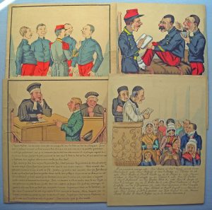 [Caricatures] Gustave FRISON (1850-). 15 lithographies aquarellées, env. 32 x 25 cm, qqs défauts, B.E. Scènes de militaires, anticléricales, mariage, justice, dont L'histoire de France à la Chambrée, Mémoire des travaux exécutés dans...